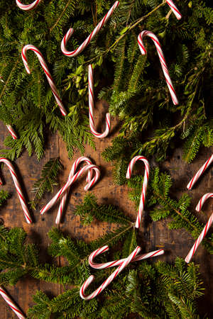 New Year Christmas Xmas holiday party celebration candy canes fir tree branch copy space green color paper wide long banner.