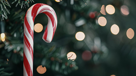 A cane is hanging from a branch on a Christmas tree. The tree has glowing lights around it. The setting is festive and filled with holiday spirit.