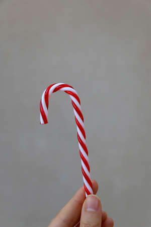 Unrecognizable person holding a candy cane decoration. Selective focus, simple background.