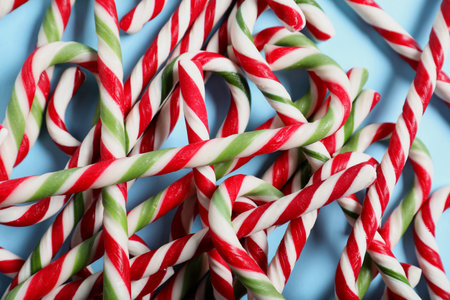 Tasty candy canes on light blue background, flat lay. Christmas treat