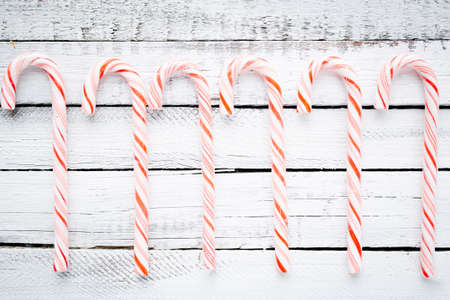 Christmas festive concept, A lot of traditional New Year sweets candy cane on a white marble table. Background, Top view copy space