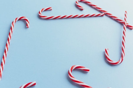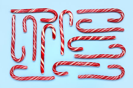 Christmas candy canes on pastel blue background. Merry Xmas concept. Peppermint red white striped traditional kids candies flat lay, pattern.
