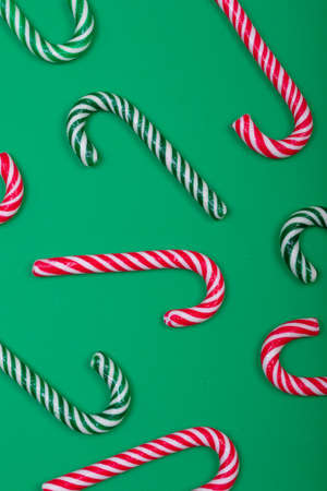 A top view of candy canes isolated on green background - perfect for wallpaper