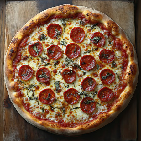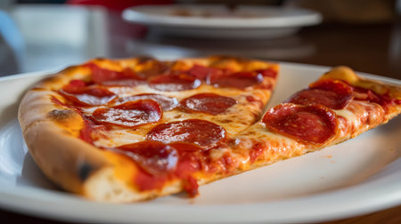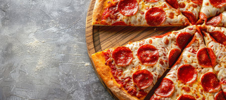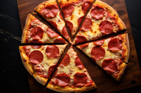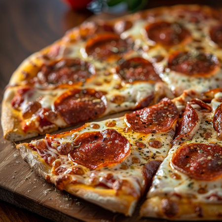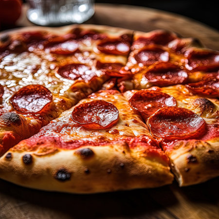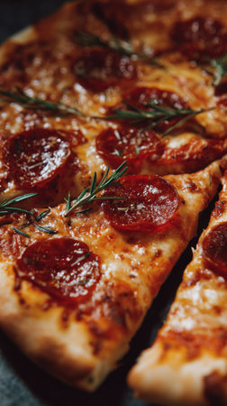 Delicious Rustic Gourmet Classic Spicy Pepperoni Pizza Slices with Melted Cheese and Herbs
