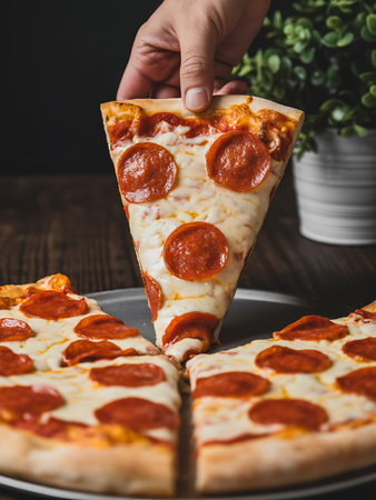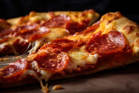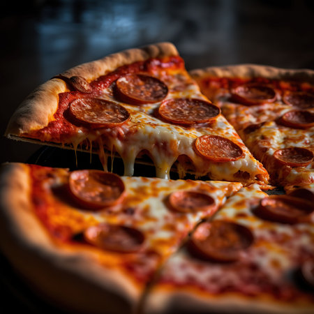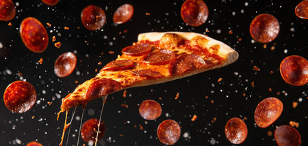 A digitally crafted image showcases a slice of pepperoni pizza with gooey cheese on a dark-textured background