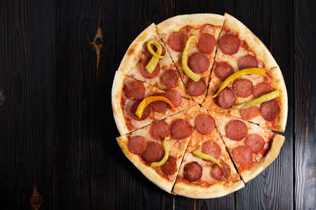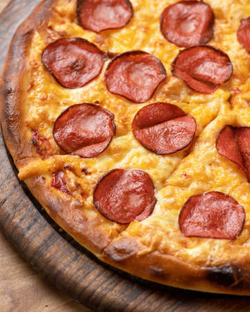 Fresh baked traditional italian pizza Alla Diavola with pepperoni and hot salami on wooden background