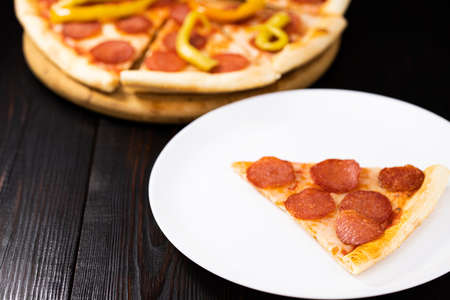 Pepperoni pizza. Hot homemade food. Slice of fresh italian classic salami pizza. Popular topping with cheese. Baked meal.