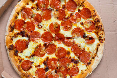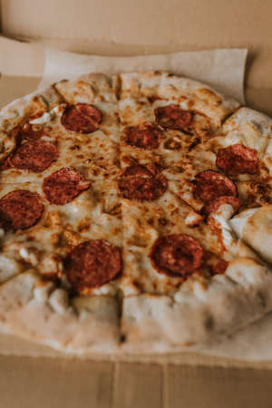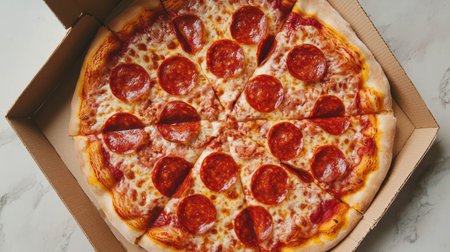 Delicious sliced pepperoni pizza in cardboard box for culinary delight
