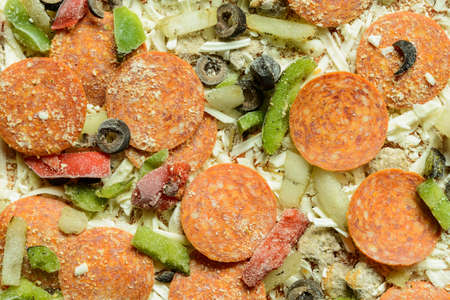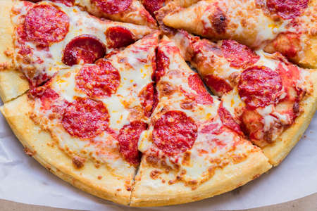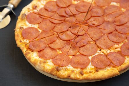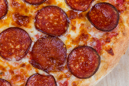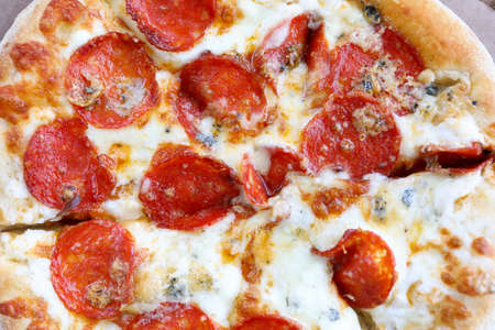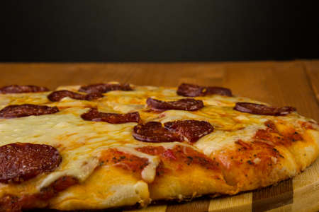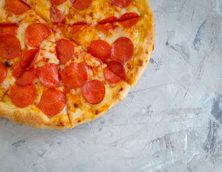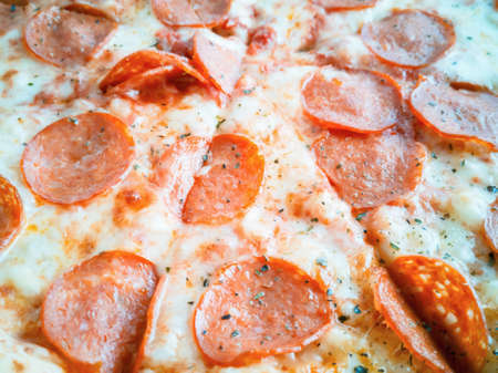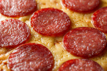 Delicious and appetizing background. Pepperoni pizza closeup with selective focus.