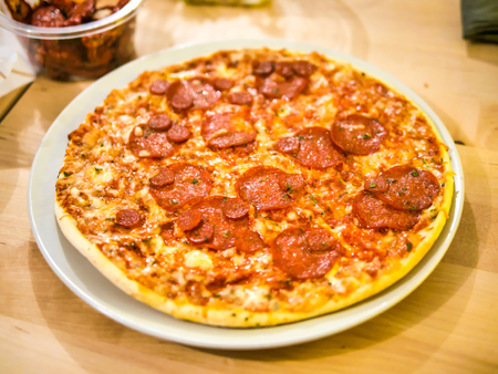 Pepperoni Pizza with Mozzarella cheese, salami, pepper on a wood table.