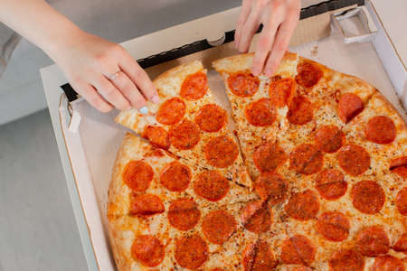 Womens hands take pieces of mouthwatering pizza out of the box. Delicious fast food. High quality photo