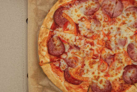 A large round juicy mouth-watering pizza with cheese and salami lies on a cardboard box from a delivery package. paper backing. close view. see flour. good thin dough