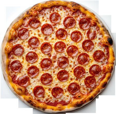 Pepperoni pizza with melted cheese on transparent background, delicious food concept