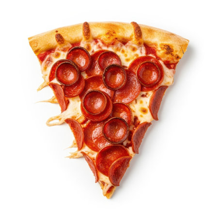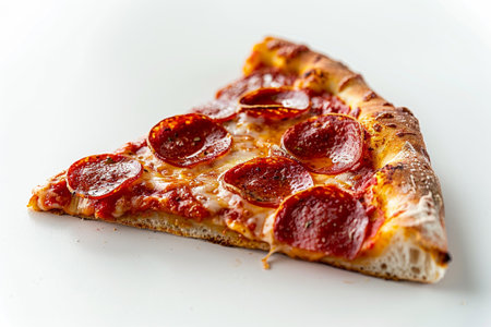 Enjoy a tempting slice of pepperoni pizza! Perfect for restaurant menus, food blogs, or social media. Fresh ingredients on a clean white background.