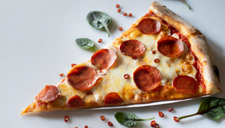 This captivating image features a savory pepperoni pizza slice flying mid-air against a crisp white background, highlighting its bubbling cheese, crispy edges, and vibrant toppings in exquisite