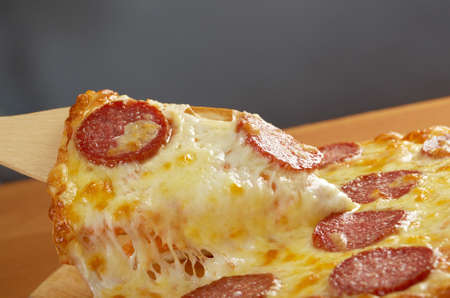 pepperoni pizza slice close up with cheese and salami