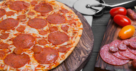 Tasty pepperoni pizza on wood background. Top view of hot pepperoni pizza. With copy space. Flat lay. Banner.