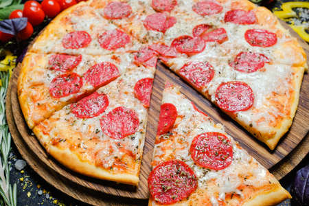 hearty italian pizza on a wooden board. cheese pizza with salami sausage