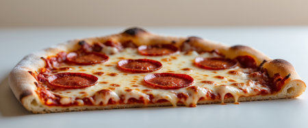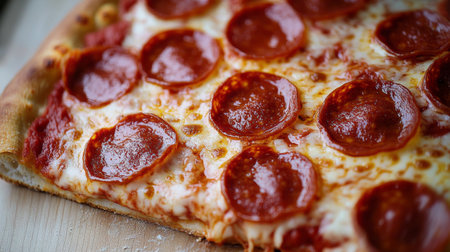 High-resolution close-up of a slice of pepperoni pizza with a crispy crust, gooey cheese, and spicy pepperoni, showcasing the vibrant colors and savory details.