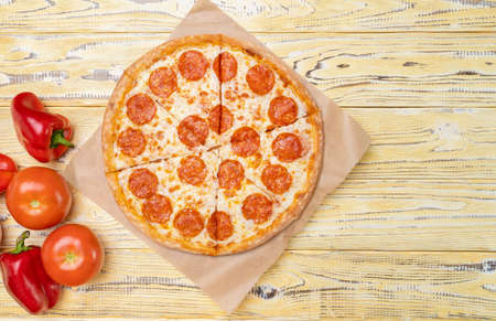 Pepperoni pizza on a light wooden background, top view. Tomatoes and red peppers nearby