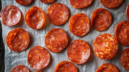 Close-up view of sliced salami arranged on white paper, showcasing vibrant red hues and tempting texture, ideal for culinary presentations and food styling.