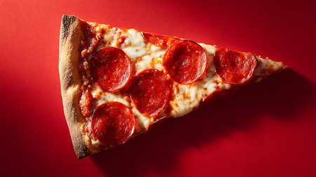 Pepperoni pizza slice on red background, top view, copy space