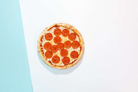 Italian pizza with pepperoni and cheese on colored background. Pepperoni pizza in minimal style on orange, white and blue colors. American pizza delivery concept with color backdrop