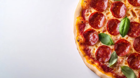 A mouthwatering pepperoni pizza topped with fresh basil sits on a vibrant blue background, creating an appetizing visual for food lovers and culinary enthusiasts.