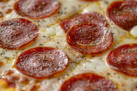 Delicious close-up of freshly baked pizza with pepperoni slices topped with herbs and spices, perfect for food enthusiasts and culinary lovers.
