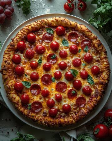 Gourmet Italian pizza with cheese, pepperoni, and fresh fruit - appetizing and delicious.