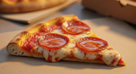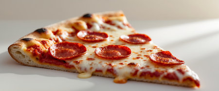 A close-up shot of a single slice of pepperoni pizza, featuring melted cheese and vibrant red pepperoni, set against a neutral background with soft, inviting lighting.