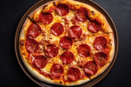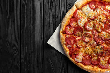 pepperoni pizza on dark black wooden board, top view, place for text, traditional italian pizza