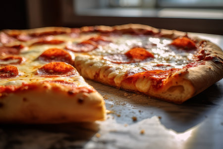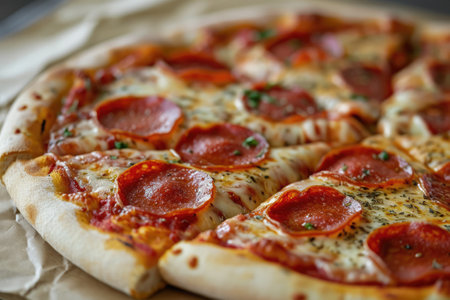 Fresh baked pizza with crusty cheese and hot tasty pepperoni ready to eat close-up