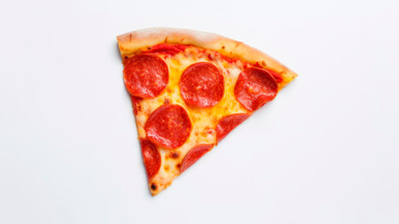 Enjoy a tempting slice of pepperoni pizza! Perfect for restaurant menus, food blogs, or social media. Fresh ingredients on a clean white background.