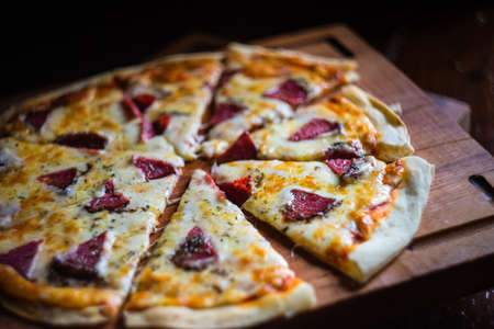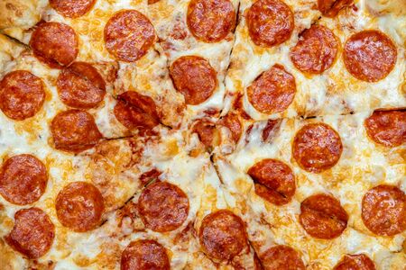 Delicious and appetizing background. Pepperoni pizza closeup with selective focus.