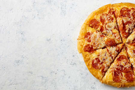 Delicious and fresh pepperoni pizza. Lies on a bright and even background in full screen.