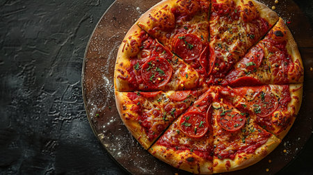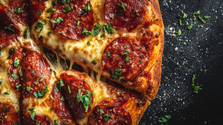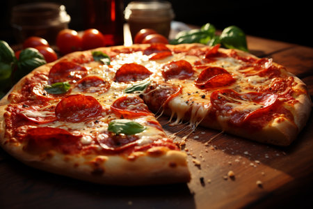 Delicious Rustic Gourmet Classic Spicy Pepperoni Pizza Slices with Melted Cheese and Herbs