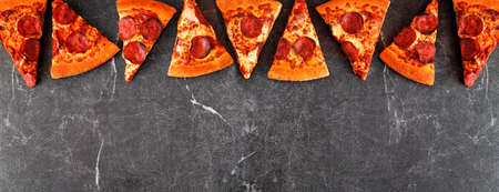Pepperoni pizza slice top border. Top view over a dark slate banner background. Copy space.