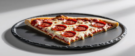 AI Generated. Mouthwatering pepperoni pizza slice on a dark slate serving plate culinary perfection savory delight close up studio shoot