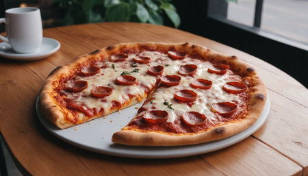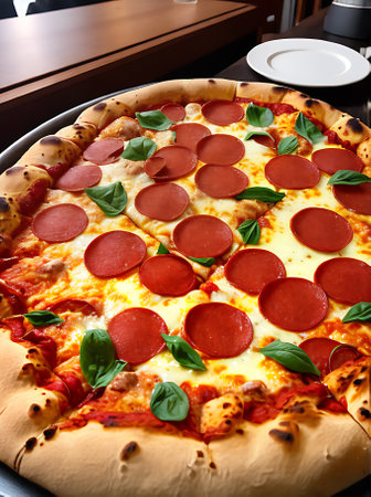Cheesy Pepperoni Pizza in Cafe Setting
