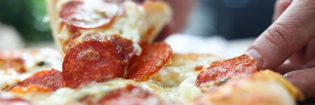 Close-up hands take slice pizza with sausages