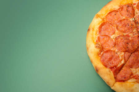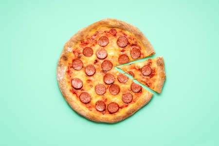 Flat lay with a pepperoni pizza on a green mint background. Single slice of pizza pepperoni top view. Homemade pizza with mozzarella, sausage and tomato sauce