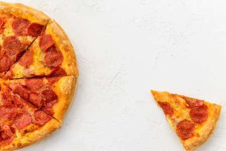 Tasty hot homemade pepperoni pizza on white background. Traditional classic pizza with salami and cheese. Top view with copy space for text. Flat lay
