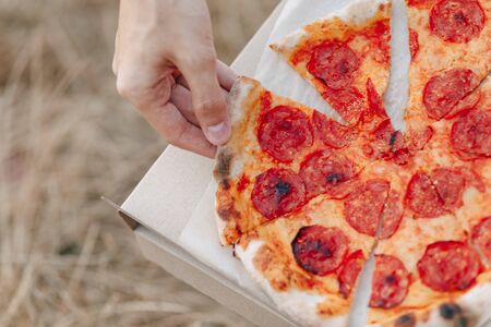 male hand takes pizza from box outdoors