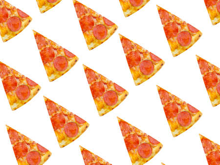 Seamless pattern of slices of pizza on a white background.