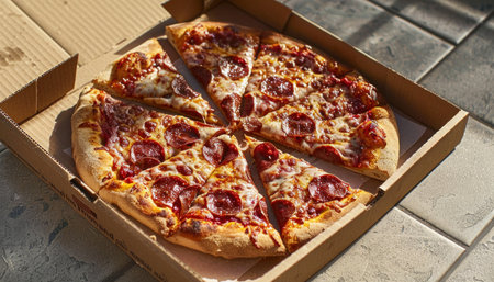 Delicious sliced pepperoni pizza in cardboard box for culinary delight