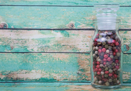 Mix peppercorn variety in vial glass over wooden background