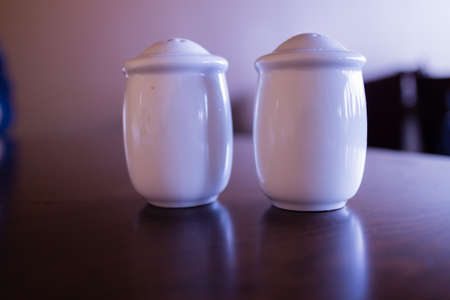 Ceramic salt and pepper shakers on wooden table at restaurant background.