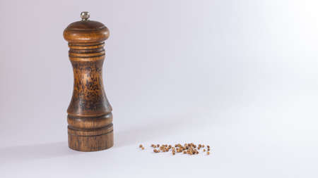 A vertical of a wooden pepper mill with black peppers on the white background