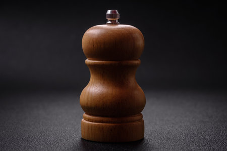 Beautiful wooden figured pepper shaker or salt shaker with a mill on a dark textured background